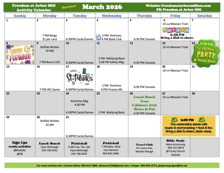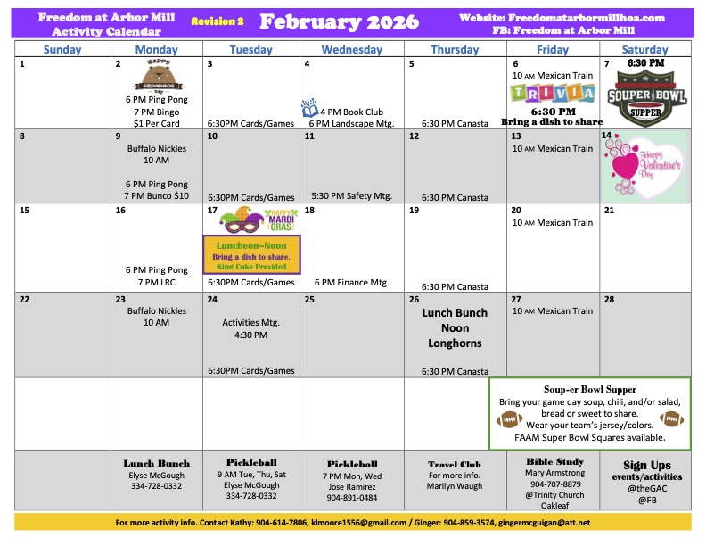 Here are copies of the February & March 2026 activities calendar for Freedom at Arbor Mill. You can click on the image to open. Please print a copy of the attached calendar for a list of all the activities planned for the month.